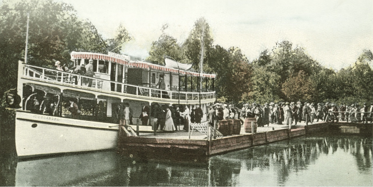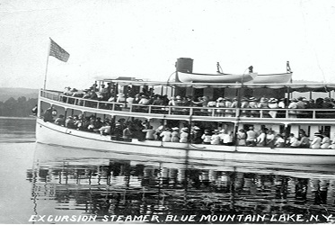 In 1900, William West Durant commissioned TUSCARORA, a 75-foot double-decker steamboat, for the Eckford Chain of Lakes: Blue Mountain, Eagle, and Utowana. Until 1929, she served resort hotels like the Prospect House and Holland’s Blue Mountain House, and was a link through service to the railhead in Raquette Lake.