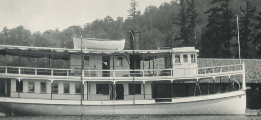 In 1900, William West Durant commissioned TUSCARORA, a 75-foot double-decker steamboat, for the Eckford Chain of Lakes: Blue Mountain, Eagle, and Utowana. Until 1929, she served resort hotels like the Prospect House and Holland’s Blue Mountain House, and was a link through service to the railhead in Raquette Lake.
